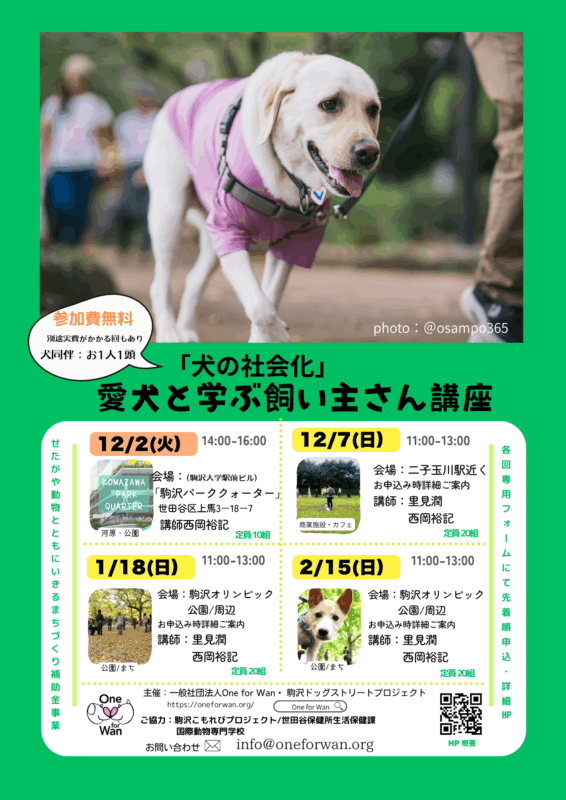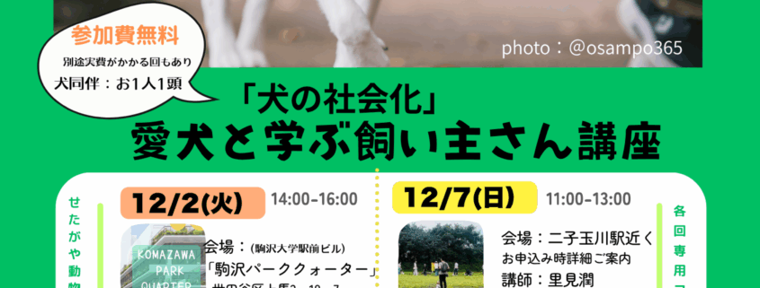 【第2回】 12/7(日)【第3回】12/2(火)「犬の社会化~愛犬と学ぶ飼い主さん講座(犬同伴実習)」募集!~2025年度せたがや動物とともにいきるまちづくり補助金事業