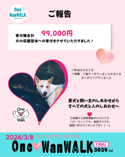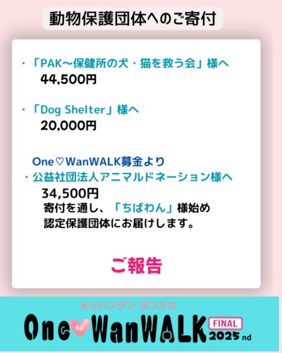 ・One♡WanWALK募金より公益社団法人 アニマルドネーション様へ 34,500円の寄付を通し